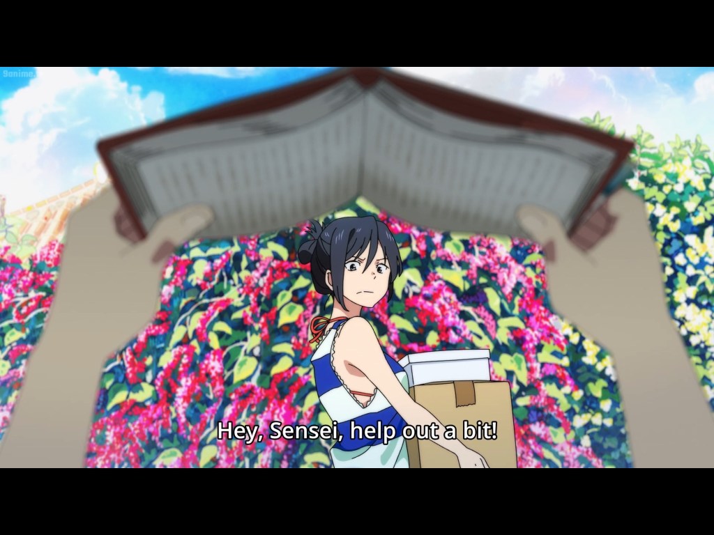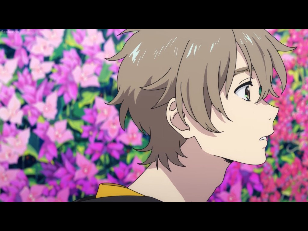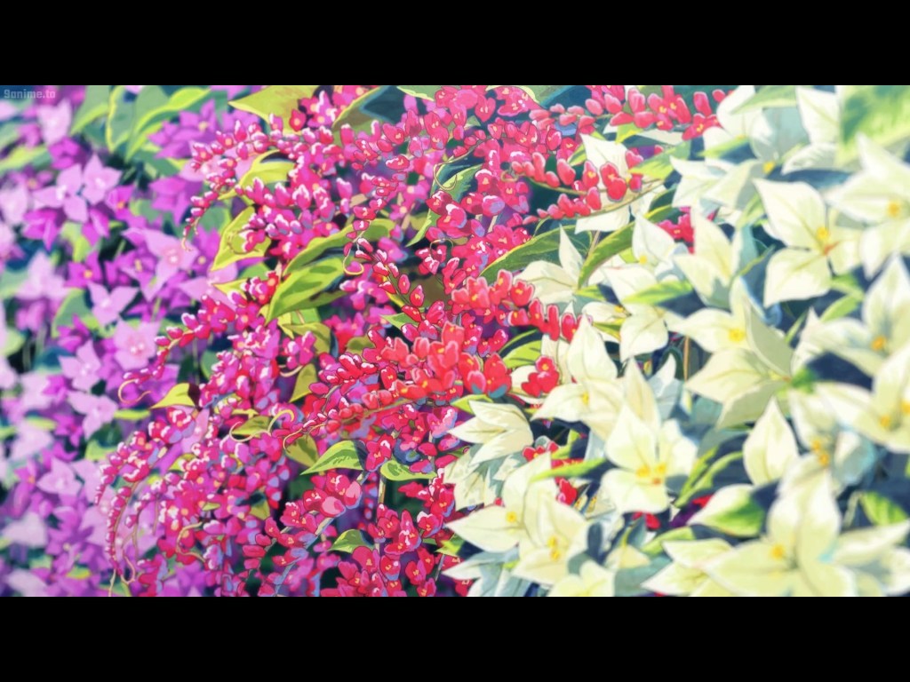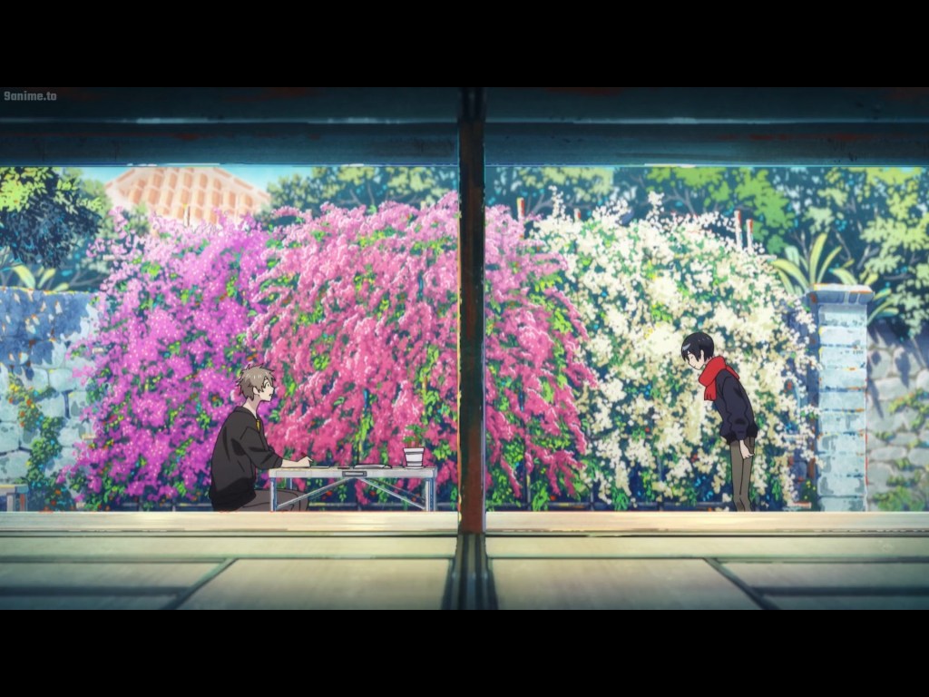 The cinematography does a fantastic job at highlighting how these spaces intersect as scenes change erratically when the perspective switches between Mio and Shun. This contrast can be seen as simply as two different colored blooms growing together.